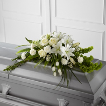 The FTD® Resurrection™ Casket Spray inspires thoughts of comfort and peace to those wishing to pay their respects for the loss of the deceased. White tulips, roses, snapdragons, Oriental lilies, larkspur, carnations and monte casino asters are accented by the bright green stems of Bells of Ireland and an assortment of the finest lush greens to create the perfect arrangement to display on the top of their casket during their final farewell service.
