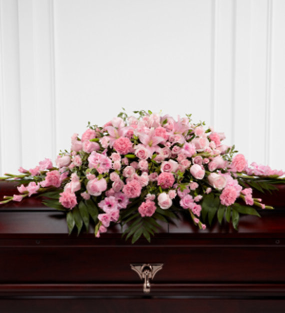 "Honor a loved one who was sweet, compassionate and charming with our Garden of Comfort™ Casket Spray. It is crafted with care and composed of a refined array of pink lilies, gladiolus, roses, carnations and accents of luscious greens. This arrangement is a touching tribute that beautifully expresses your love. - Details: o Spray is approximately 48""W x 38""D"