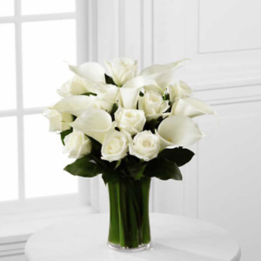 The FTD® Sweet Solace™ Bouquet is a divinely elegant arrangement that encourages peace and offers your sympathy. Brilliant white roses and calla lilies are simply set amongst lush greens in a clear glass gathering vase to create a meaningful gift that will help your special recipient through this trying time.