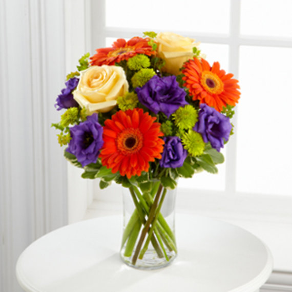The FTD® Rays of Solace™ Bouquet is a cheerful burst of color to extend your deepest sympathies. Crème de la Crème roses, orange gerbera daisies, purple lisianthus, green button poms and a mix of vibrant greens are beautifully arranged in a clear glass gathering vase to create a warm bouquet expressing hope with every colorful bloom.